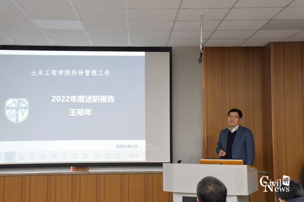 蒲黔辉院长做了学院工作报告和个人年度述职。蒲院长系统的从学校师资力量、人才培养、科学研究、实验室建设、对外合作交流情况、学生管理、资产管理与环境提升几个方面做了总结汇报,并表示在第五轮学科评估中,土木工程学科发展取得新突破,同时也强调,在后交通时代加快传统土木学科转型升级的必要性与紧迫性。