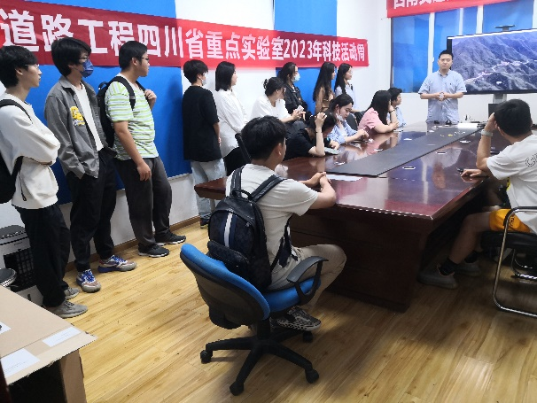 当同学们对道路工程有了初步的印象和感受后,回到讨论室,实验室老师对道路工程实验室的基本情况进行了全面的介绍。道路工程四川省重点实验室专注于道路工程领域的科学研究和技术创新,主要从事路基路面综合设计理论与方法、新型路面材料研发与应用及道路建养智能化应用等研究领域。带着对实验室的好奇与未知,同学们听得尤为认真。此外,还通过播放《中国公路》、《中国最美公路》、《中国公路:500万里的故事》等科普视频带同学们快速领略中国公路风光及发展历程。生动直观的展现形式使本次科普活动内容更为丰富,激发了同学们对道路领域的兴趣。