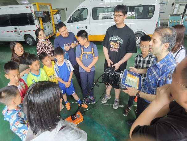 首先,带领同学们参观了路面多功能智能检测车相关硬件和软件,战友老师和研究生同学为大家讲解了公路智能检测相关知识。精彩细致的讲解让同学们深入了解到先进的硬件设备和软件系统是保障路面检测高效和准确性的基础,切实体会了智能检测在道路工程中的重要性。小学生们对智能化技术展现出浓厚的兴趣,在路面智能检测效果展示环节,全部凑到电脑屏幕前观看并不时发出感叹声。