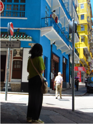 这里还充斥着许多特别的色彩,淡紫色的公交车驶过时一下神摇目夺。走进繁华热闹的香港湾仔街市,一大排彩色的屋子出现在眼前,在高楼林立、寸土寸金的城市里寻觅那幢全身上下“穿”着蓝外套的蓝屋。