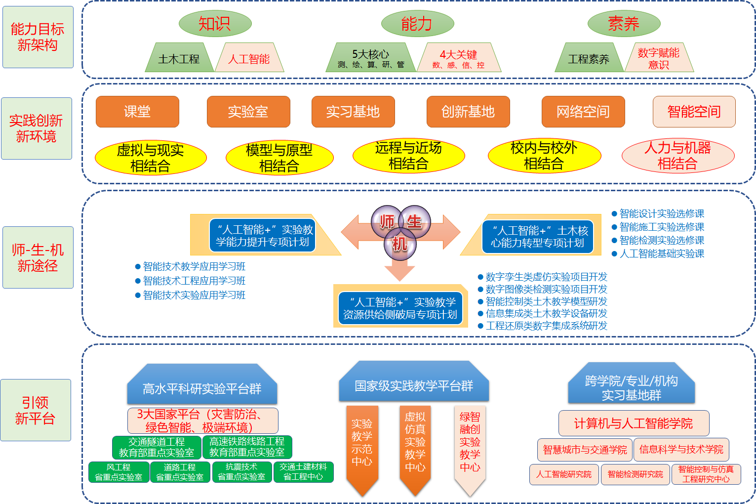 )将继续紧跟国家教育数字化战略行动、人工智能时代新趋势和新要求,以解决“智慧土木”人才培养的目标架构和实现路径为根本任务,重点围绕高质量土木工程人才培养重点环节——实践创新能力的培养展开工作。主动对接国家和行业发展需求,确立实践创新能力培养的具体目标;重点投入新课程、新团队和新基地建设,打造“智慧土木”人才支撑平台;以建设三大类“人工智能+”专项计划为抓手,守正创新重塑实践育人体系,为学科转型升级奠定坚实基础。