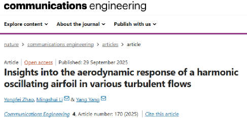 风工程团队的最新研究成果《Insights into the aerodynamic response of a harmonic oscillating airfoil in various turbulent flows》,博士生赵勇飞为第一作者,李明水教授和杨阳老师为共同通讯作者。该研究,系统性地揭示了湍流对振荡翼型非定常气动特性的影响机理,为风能、低空经济和大跨度桥梁设计等工程领域提供了理论基础。