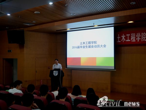 党委副书记李锦红就2015届毕业生的就业数据出发,分析了2016届毕业生就业总体情况、就业行业和企业、就业城市和地域、相关单位签约情况、班级就业数据等。李书记总结到,从这些数据里可以发现未毕业人数逐步减少,毕业生就业率较为稳定。李书记表示,随着中国经济的发展,对于土木行业的学生来说,未来的战场主要在西南地区,这里的铁路和公路方面人才需求量在增加,人才输入还未饱和。分析往年数据,中国建筑和中国高铁方面的企业是大多数毕业生的选择,同时,近乎三分之二的毕业生选择在二线城市工作。李书记还指出,现在的大部分毕业生缺乏就业观,不主动,喜欢把自己的命运交给“随便”两个字,常怀一种随遇而安的心态,但找工作是人生中一件非常重要的大事,其对人生的影响程度并不亚于高考。接着李书记告诉大家所谓的好工作并非指环境好、压力小、收入高,适合自己的职位更为重要,为实现自我价值和目标快乐而坚定的工作,这才是最好的状态。李书记借用苏格拉底和柏拉图关于“什么是爱情”、“什么是婚姻”、“什么是生活”的三个故事引导学生要学会选择,并且给学生提出三条就业选择的原则:理想是美好的,但它不一定是现实的存在;选择了就相信这是现实里最好的,爱上它;相信未来,把握好现在!李书记又从实际出发,告诉了大家几条可行的建议:静下心来,认清自己;在招聘会和互联网里对工作淘宝;寻找自己的优势,并让企业认同你;做好自己的简历,有一个完美的形象。