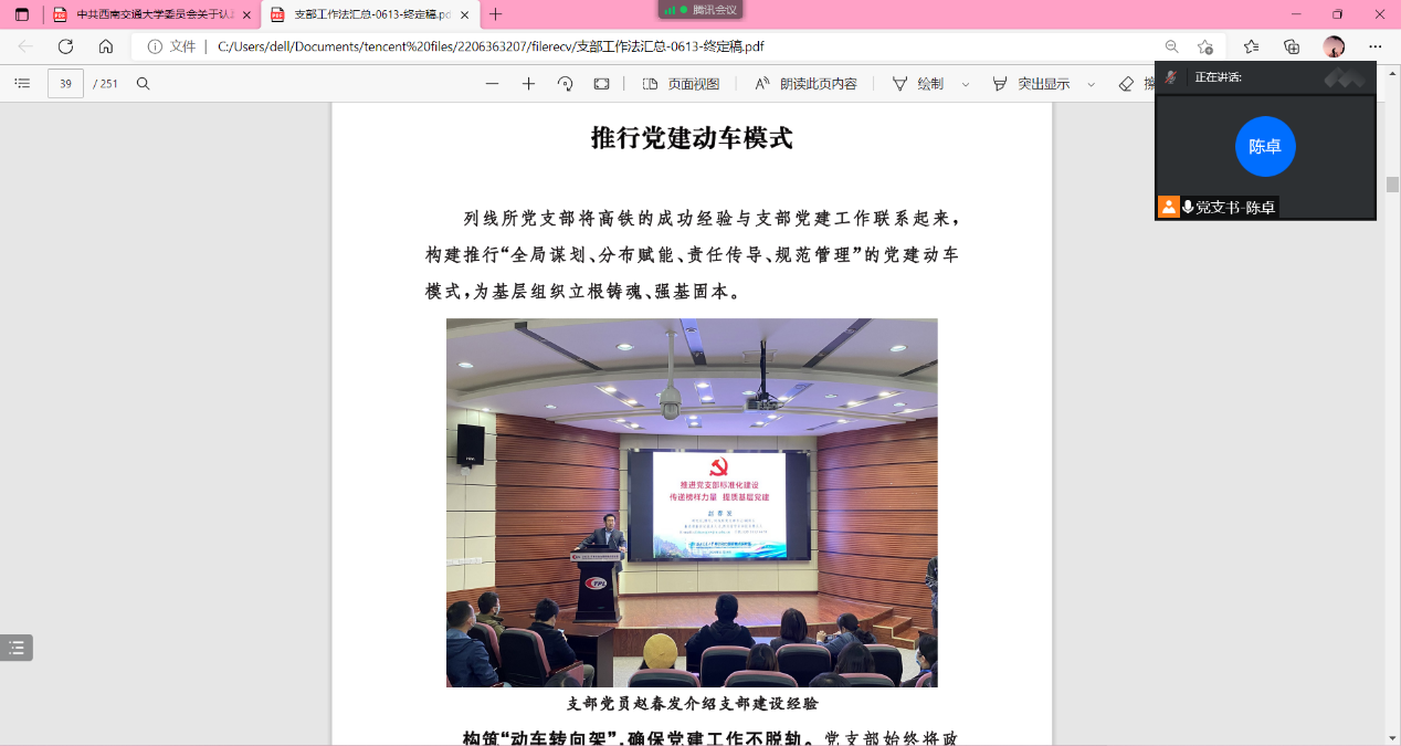牵引动力国家重点实验室列车与线路研究所党支部的“三抓三筑三提升”工作法作为学习重点。