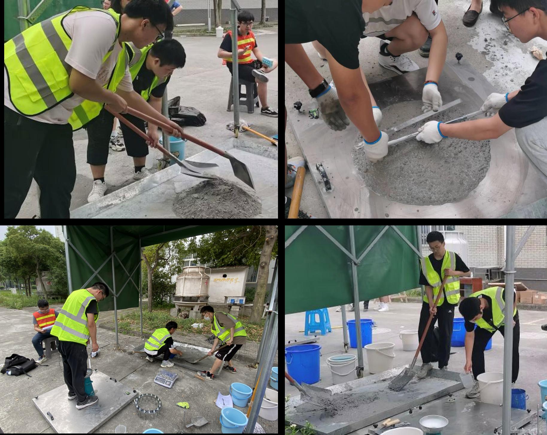 经过一天的紧张比拼,15支队伍在比赛现场展示了各自的混凝土材料设计方案。选手们专心细致的对混凝土材料进行处理,并通过精确的测定扩展度、J环扩展度及T500展示了自身设计方案的混凝土工作性。