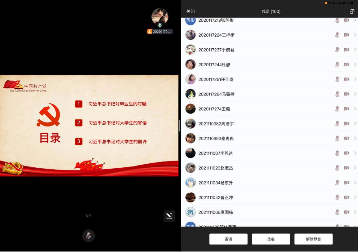 2023年6月14日晚,土木学生造价、城地、道桥党支部共同组织展开了“习近平总书记与大学生在一起”主题党日活动,本次活动采用线上腾讯会议的形式进行。会议由城地党支部书记李泽超同志主持,由道桥党支部宣传委员王澄宇进行讲解分享,三个支部全体党员参加了会议。