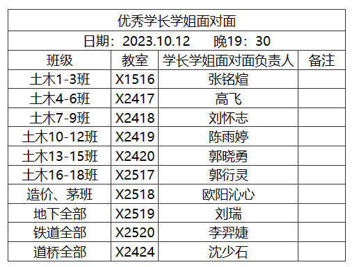 大学生学业与发展指导中心将于2023.10.12日晚19:30在新生年级范围内开展优秀学长学姐面对面活动。参与本次活动的学长学姐均为荣获2022年度十大优秀本科生荣誉称号的学生。学长学姐将通过围绕自身的学习经验、竞赛经验、学生工作经验以及科研经验开展本次面对面活动。希望2023级土木新生能够认真聆听并感悟优秀学生个人成长经验,构建属于自己的美好并且丰富的大学生活。活动教室以及分配班级如下所示: