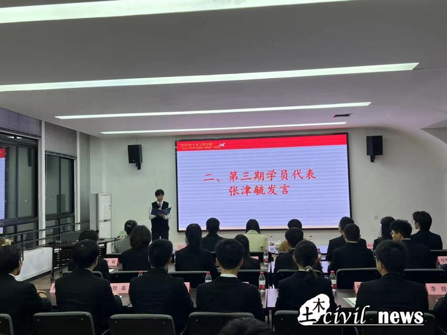 “红志”班第三期学员代表张津毓同学上台发言。张津毓向同学们分享了自己在“红志”班的学习经验和心得体会,鼓励同学们勇立鸿鹄志,在第四期“红志”班中认真学习,提升自我,做一个有思想的行动家,将自己的奋斗与国家紧紧相连,永远年轻,永远昂扬。最后张津毓同学希望学弟学妹们能放开眼界,苦心钻研,以青春之我不负韶华之年。