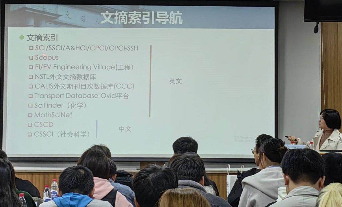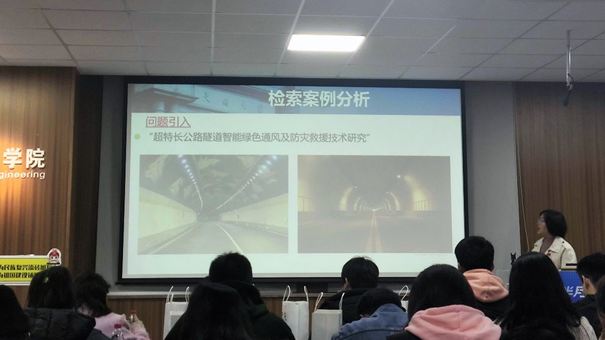 紧接着,朱维凤老师为同学们详细介绍了文摘索引导航、中/外文期刊导航、专利导航、学位论文导航中的各个资源及其侧重点,如文摘索引导航只有摘要题名,专利导航中CNKI提供专利引用标准格式等。同时,朱维凤老师还提醒了同学们学校提供的文献传递、校外访问等获取资源途径的具体流程。