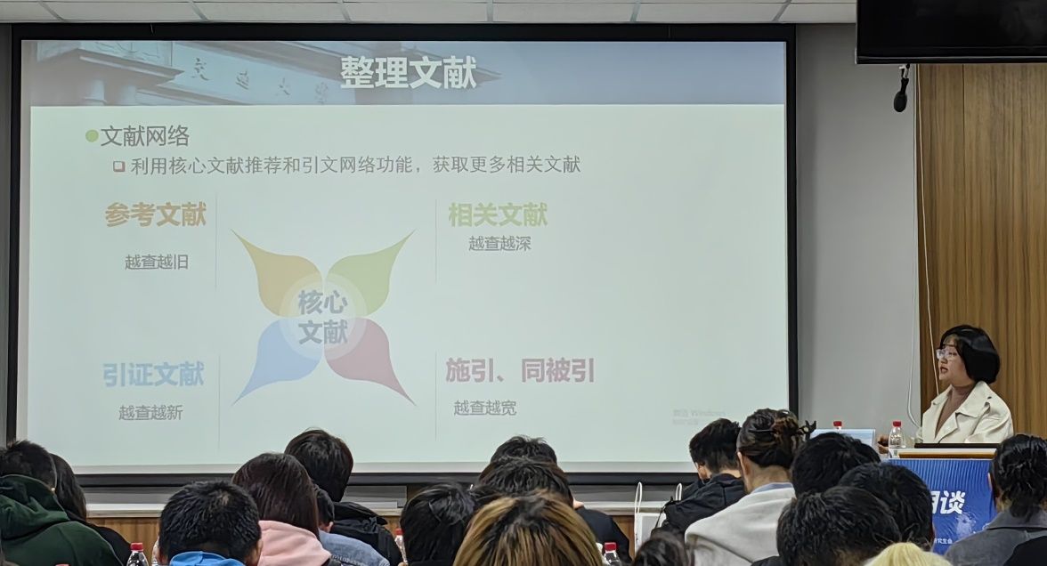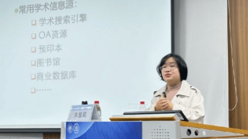 讲座伊始,朱维凤老师以“如何进行文献调研”为题切入,强调了在互联网时代提升自己的信息检索素养于同学们科研旅途的重要性并从常用学术信息源、文献调研流程及检索案例分析三个方面展开讲述。