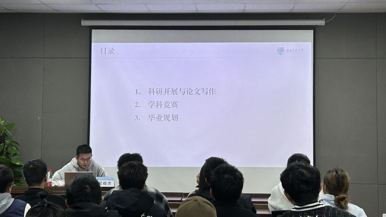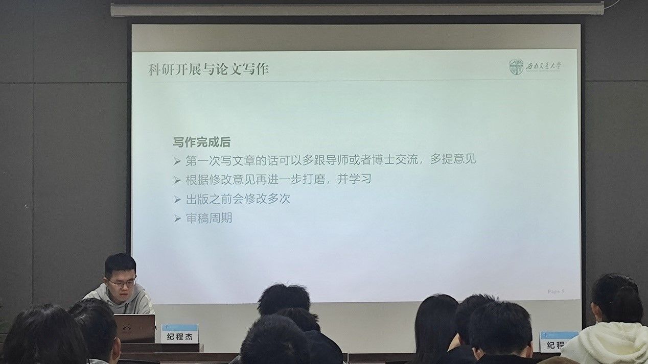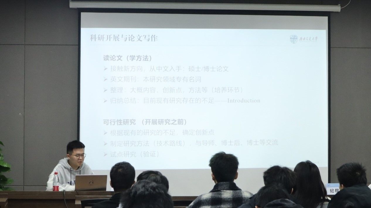 在主持人详细有序的开场介绍及同学们的热情掌声后,纪师兄从科研开展与论文写作、学科竞赛及毕业规划三个方面展开了本次讲座的分享。