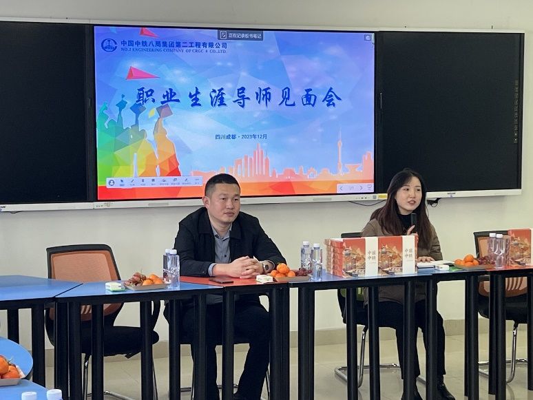 第一环节:中铁八局二公司人力资源部张美玲经理通过热情的话语进行了精彩的开场介绍,并介绍了吴朝旭导师,引出见面会的第二环节。