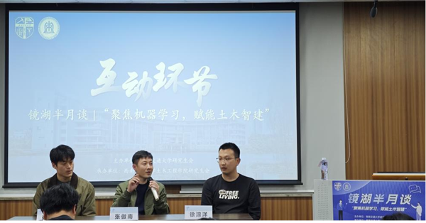 在讲座的尾声,工作人员向张傲南教授、张家康博士和徐淙洋博士献上鲜花,以表达对嘉宾们精彩演讲的敬意和感谢。随后,嘉宾与在场的全体观众一同合影,以此纪念这一难忘时刻。随着快门的按下,本次镜湖半月谈——“聚焦机器学习,赋能土木智建”讲座圆满落下帷幕。