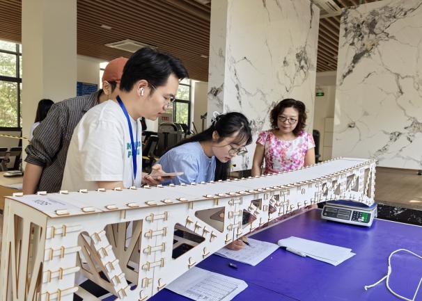 党委书记郑江、桥梁工程系副教授王骑、九里校区学生党总支书记石莹等深入加载测试现场指导工作,共同观摩了35组模型的荷载加载过程。在对编号“Y018”模型加载时,郑书记详细询问设计团队关于“拱肋厚度与荷载分布的力学关系”,对队员结合材料力学公式优化结构的思路给予高度肯定,并勉励选手善于运用理论知识指导实践,不断探索创新。经过激烈角逐,最终23组模型凭借创新设计成功通过全荷载考验。