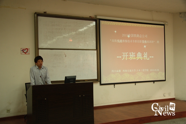 副院长任宝良教授上台讲话。任副院长简要介绍了学校119年的悠久历史,并表明学校在历史发展中,铁路相关专业不断发展和壮大,逐渐形成了西南交大在铁路方面的绝对优势。任副院长表达了学院对铁路总公司此次下达的培训任务的重视,也希望各位学员,作为总公司的骨干力量,能珍惜并充分利用这次培训机会,增加自己的知识储备,提高自己的专业能力。结合当前我国高铁事业的不断发展,任副院长指出工程发展对线路维修的技术从业人员提出了新要求。他说到,培训班将采用培训与测试相结合的方式,保证培训质量,检验培训效果,希望大家认真对待培训内容,遵守考勤制度,在最后的测试环节能达到80分的合格线。最后,任副院长嘱咐大家多注意天气变化,照顾好自己的饮食起居,避免出现水土不服的现象。