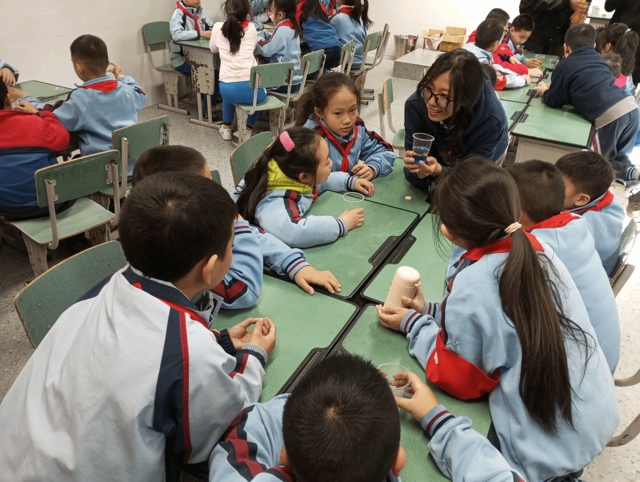 在第三周的火山爆发模拟实验中,志愿者们利用色素和泡腾片,在水油两层的液体中制造出了火山喷发的效果。这个实验不仅让小朋友们观察到了一个有趣的现象,还让他们学习了密度的概念,以及泡腾片为什么能够产生这样的现象的原理。