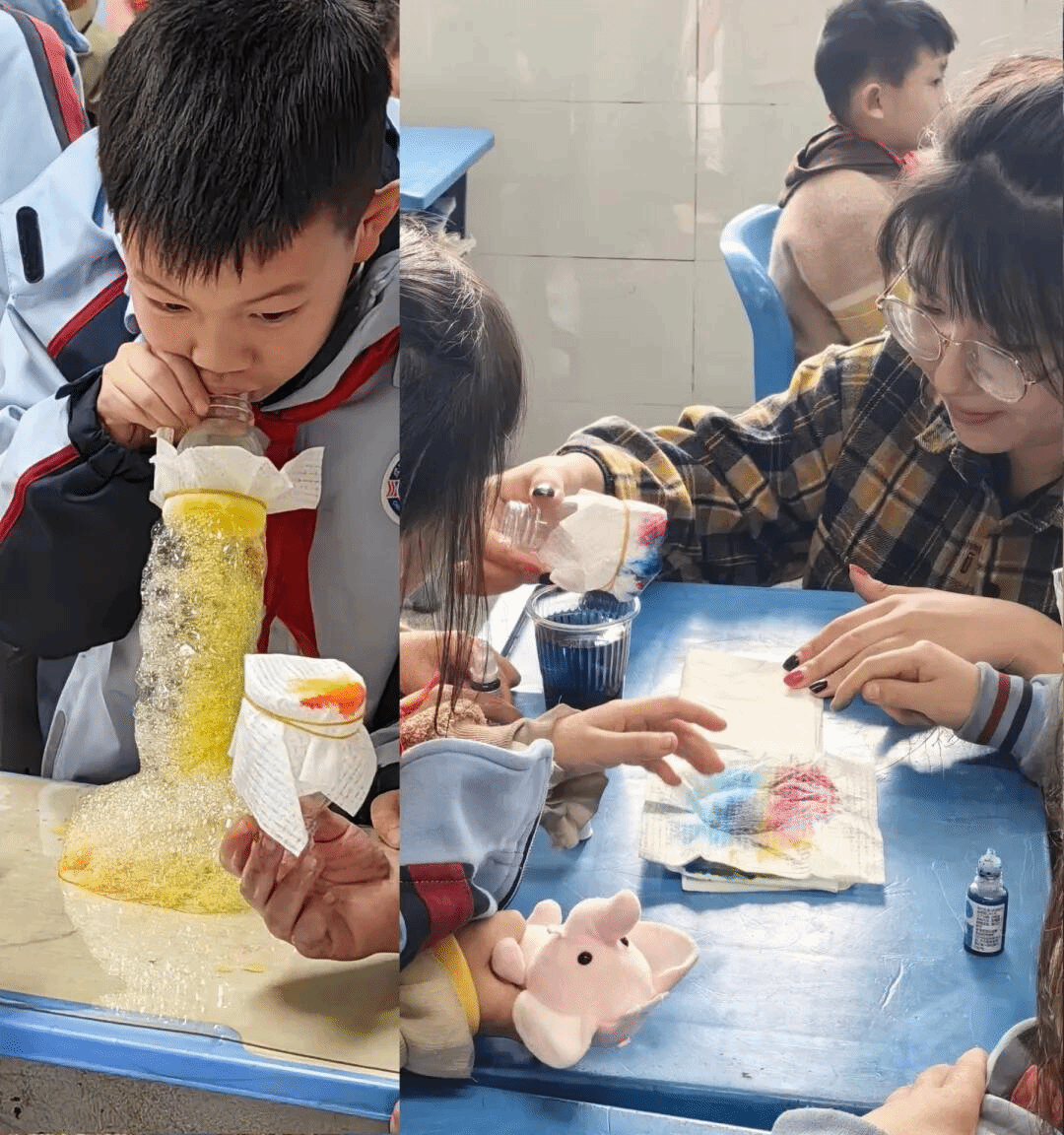 在第四周的彩虹毛毛虫实验中,志愿者们利用洗洁精纸巾和安全色素,为孩子们展示了一种有趣的科学现象。他们只需对着装有液体的瓶子吹气,就能看到五颜六色的泡沫像毛毛虫一样从瓶口冒出。这种实验不仅能够激发孩子们对科学的好奇心,也能让他们感受到科学的美丽和乐趣。我们希望通过这样的活动,培养孩子们对科学的热爱和探索的精神。