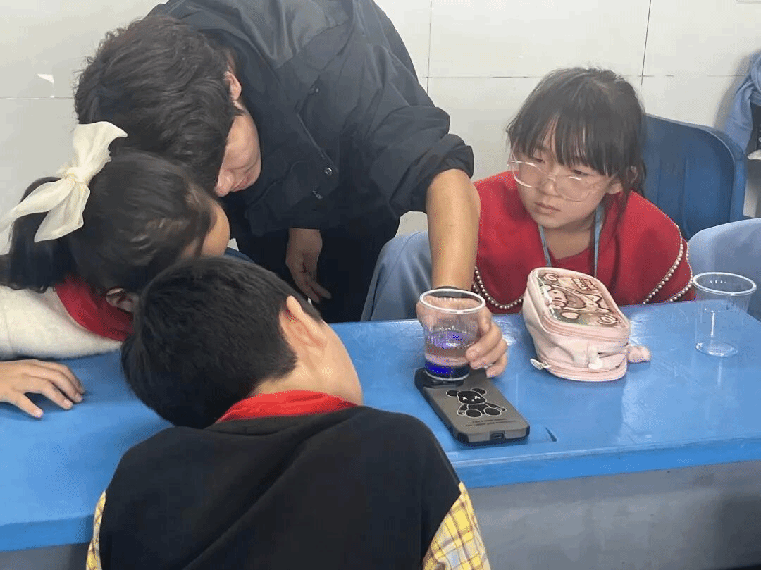 第二周的实验主题是熔岩等涉及分子变化的小实验。志愿者们准备了各种实验器材和材料,向孩子们展示了熔岩的制作过程和原理,以及其他一些有趣的分子现象。通过这些实验,志愿者们不仅让孩子们了解了分子的概念和特性,还培养了他们从宏观到微观观察和分析事物的思维方式,使孩子们能够感知到分子在自然界中的存在和作用。