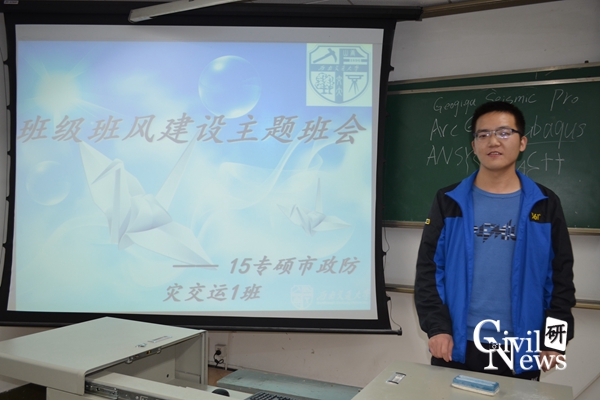2015级专硕市政防灾交运1班在逸夫馆4304A室举行了“班风建设”主题班会,班会由班长史晓主持,该班全体学生参加了此次会议。
