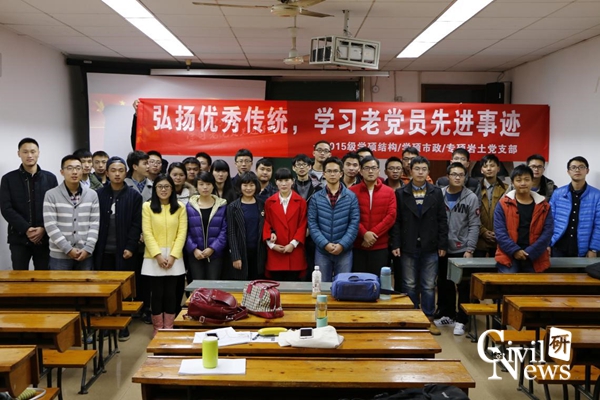 2015年12月4日19:30,2015级学硕结构1班党支部、学硕市政1班党支部以及专硕岩土1班党支部三个党支部于逸夫馆4305A召开本学期第一次党支部联合特色活动。本次会议由专硕岩土班班长姜文雨同学主持,学硕结构、学硕市政以及专硕岩土三个党支部党员以及预备党员参加了本次会议。本次会议主要内容为“弘扬优秀传统,学习老党员先进事迹”。