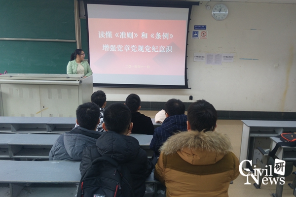 15级专硕市政防灾交运1班党支部学习“讲党性,守党规,严党纪”活动在逸夫馆4310室顺利召开,活动由党支部书记陈秒单主持。