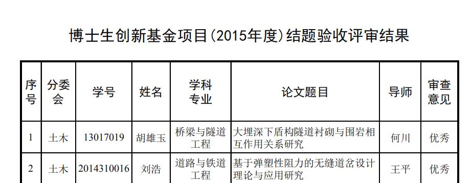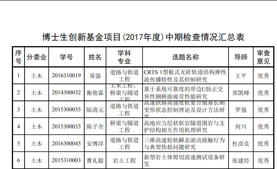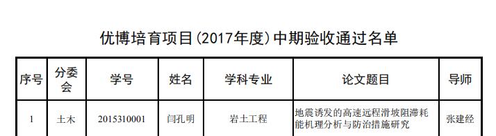 博士生创新基金项目(2015年度)结题验收评审结果、博士生创新基金项目(2017年度)中期检查评审结果、优博培育项目(2017年度)中期验收通过名单。