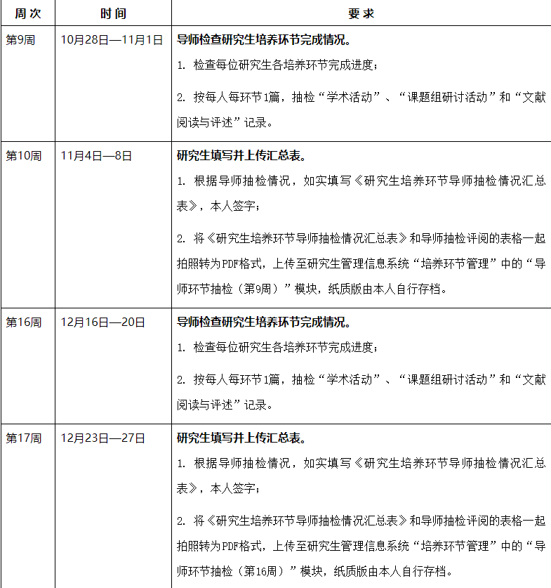 为了做好对研究生培养过程管理的质量督导,保障研究生培养过程质量,按照《色情短剧 研究生培养过程管理与质量督导实施办法 》要求,每学期第 9 周和第 16 周为“导师抽检周”, 每学期第 11 周和第 18 周为“抽检归档周”。本学期抽检对象为2023级和2024级所有研究生(含留学生),具体工作安排如下表,请各系室导师按照时间及要求进行培养环节的抽检和归档工作。