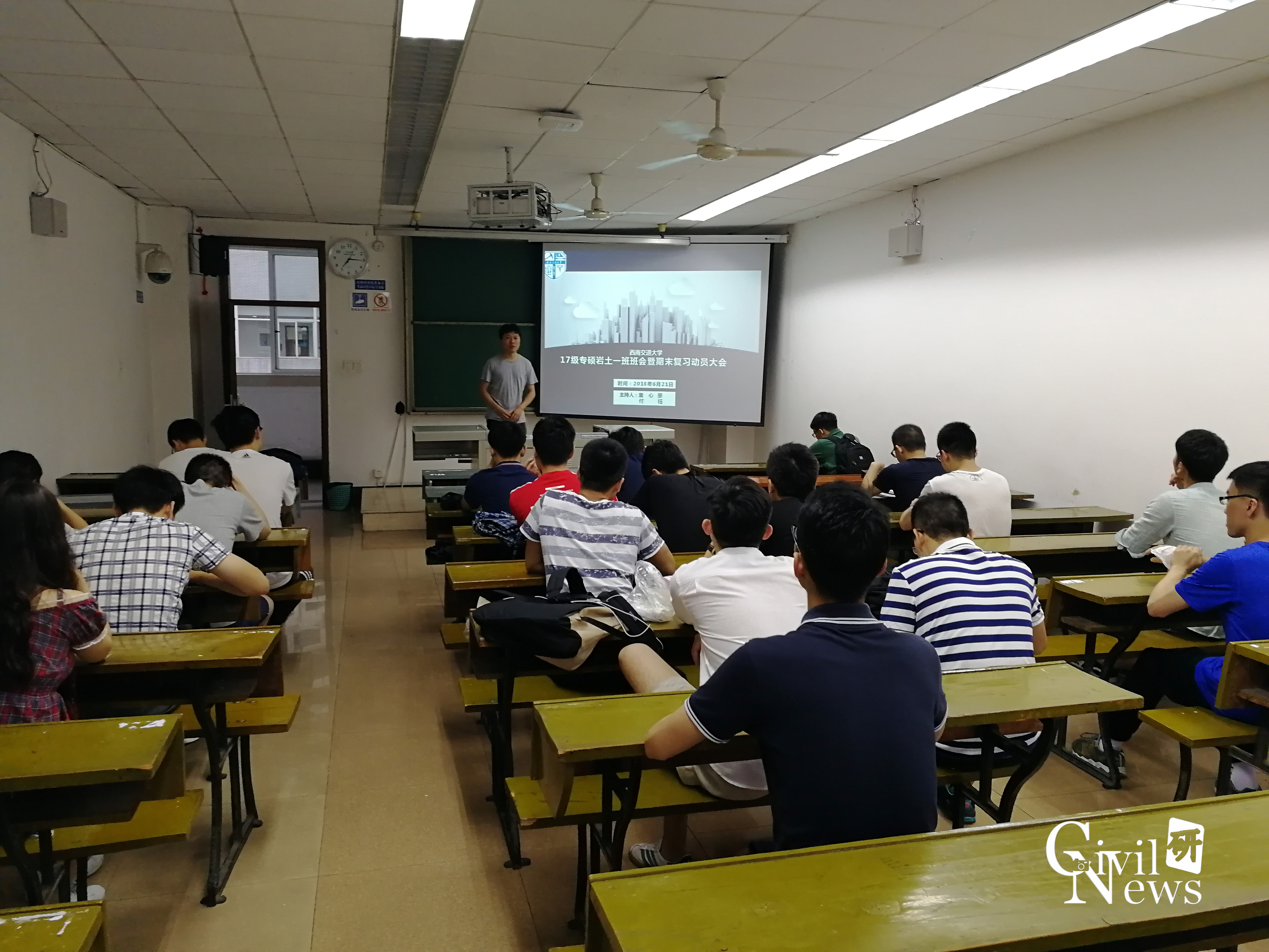 2018年6月21日晚六点半,研究生2017级专硕岩土工程一班在九里校区逸夫馆4504B教室召开班会暨期末复习动员大会。本次班会总结了本学期班级在思想、学习、科研和生活中的总体表现,对班级学风建设的系列工作做了回顾,同时,动员了全班同学做好期末复习工作,为大家讲解了复习方法和要点,以牢固知识和做好考试准备。