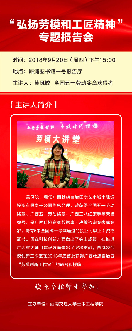 【嘉宾简介】黄凤姣,现任广西壮族自治区崇左市城市建设投资有限责任公司副总经理,曾获得全国五一劳动奖章、广西五一劳动奖章、广西三八红旗手等荣誉称号,是广西科协专家数据库·决策咨询专家库专家,持有5本全国统一考试通过的执业(职业)资格证书。因在科技创新方面做出了突出成绩,在推进广西重大项目建设方面做出了突出贡献,黄凤姣劳模创新工作室在2013年底首批获得广西壮族自治区“劳模创新工作室”的命名和授牌。
