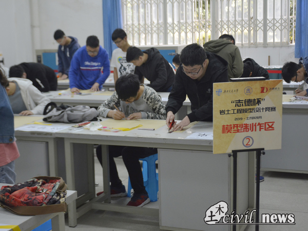 紧接着,各组参赛选手在工作人员的带领下来到指定教室为即将开始的比赛做最后的准备。比赛正式开始。各组选手都快速的进入状态,有条不紊地按照各自的设计完成模型。选手们配合默契,从容自信。每个参赛小组都圆满地完成了筋材及挡土墙的制作等工作。