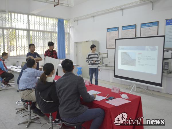 在答辩现场,各小组都准备了纸质材料与PPT向评委讲解自己的设计构思,所运用的专业知识等方面的问题,充分地展示了自己模型的特色。