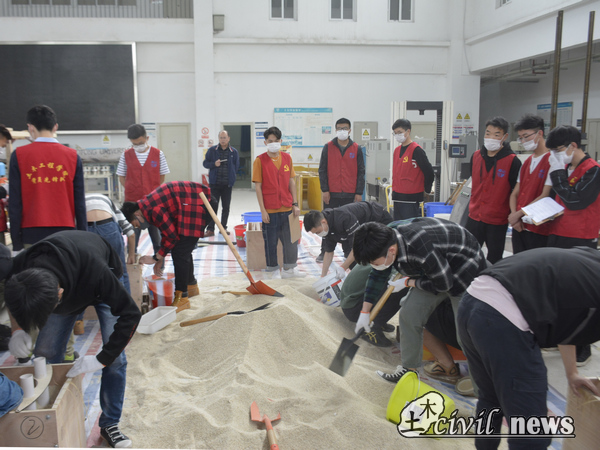 模型制作过程全部结束后,各小组按顺序在现场对模型进行加载。在加载过程中,几位评委一直在现场观看,并不时的交流着意见,由于加载现场尘土飞扬,科创中心的工作人员也很贴心地为现场人员准备了口罩与手套。参赛选手们分工明确,动作利落。一层层加砂、一层层铺设筋条,脸上写满了紧张与期待。尽管在加载过程中,有的组并未成功,但相信他们在比赛过程中也学会了很多收获了很多。