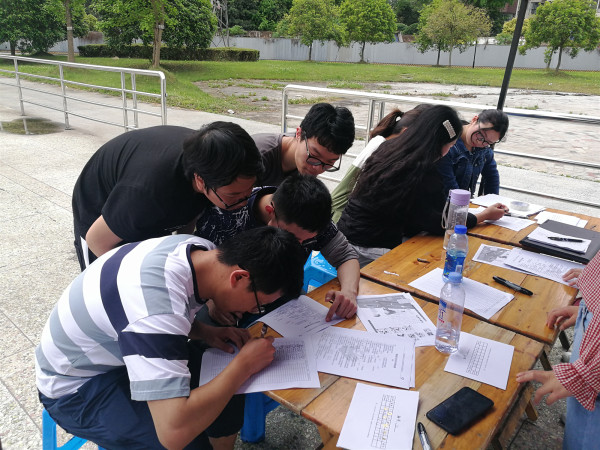 21日下午一时许,土木青协工作人员安排参赛人员在集合点集中讲解规则。虽然下午天气比较炎热,但是同学们还是认真地聆听工作人员的讲解。此次活动四人一组,每组分发一张精心制作的地图卡,正面打印地图,背面用于写明组号与贴贴纸。通过这样的方式参赛同学们可以更好的了解路线,也更有益于同学们规划自己的路线。本次比赛赛程共设7个间断点以及1个集合点。每个间断点点位备有一个独有的贴纸,工作人员给到达点位的小组的地图卡贴贴纸并登记。参赛人员每经过一个间断点参加该点位的游戏,根据游戏的表现获得相应的得分,例如正话反说、猜字谜、接弹力球、背古诗等小游戏。