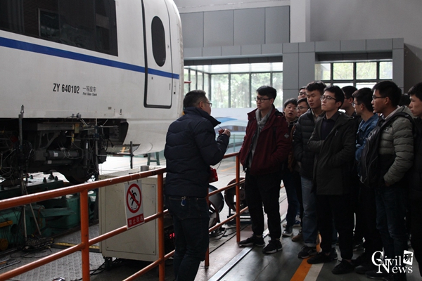 接着,王思明老师的带领下,同学们进入牵引动力实验室内部,正式开始参观。王老师为同学们讲解第一个参观点,为部件完整的一节动车厢 ,通过底部的滚轮,可以用来模拟真实的列车运行,模拟速度可以达到400km/h以上,同学们认真聆听并不时发出惊叹,同时,对结构原理等不理解的地方也踊跃提问,王老师便热情解答并拓展一些相关知识。