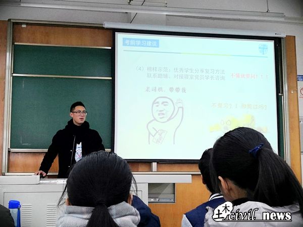 班会上辅导员老师首先从期末考试成绩的重要性出发,给予同学们一些考前复习建议,鼓励学生以寝室为单位、以班级为单位组织开展集体自习活动,班委和成绩优异的同学应当起带头作用,安排制定班级考试复习计划,积极对接联系助辅和对接寝室的党员进行答疑和咨询,同时2018级年级组给新生申请了15至17周集体晚自习的教室。为树立“以诚实守信为荣”的诚信考风意识,辅导员从多方面阐释分析了作弊对于考生在各个方面的影响,最后对《色情短剧