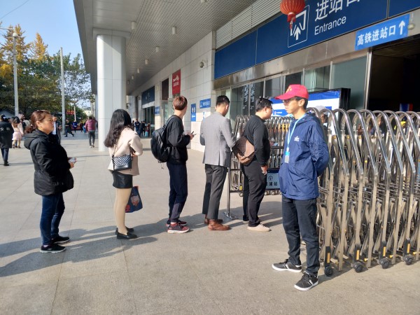 来到高铁站,经验丰富的队长们就开始分工了,“你们三个,在门口这儿,你们三个,站检票口,你们几个,跟我去楼上……”不一会,大家就开始了自己的工作。
