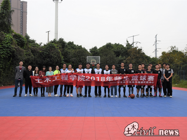 2018年师生篮球赛”的横幅合影留念。