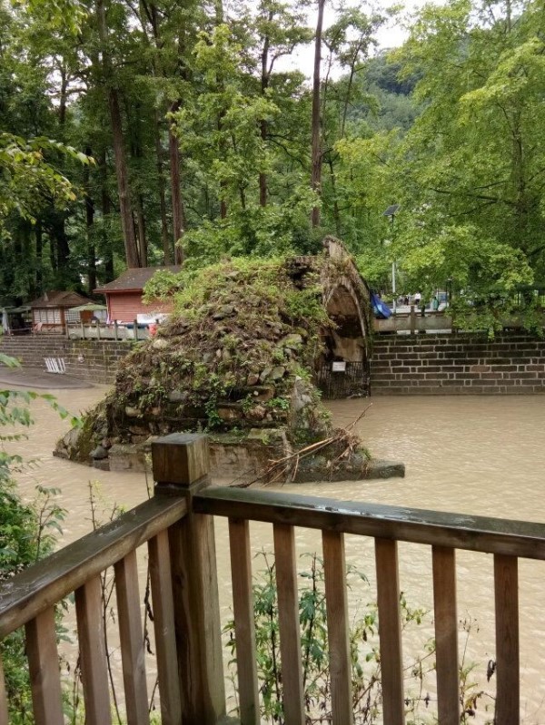 这是5.12地震后留下的遗址。中法桥,又名金桥,始建于1893年,由当时的下书院院长法国人鱼霞松亲自设计建成,砖石结构,双孔拱桥,全长30.8米,宽4.7米,跨度9.65米,拱高5米,桥栏高1米,桥面用青石板铺成。原桥古朴典雅、工艺精巧,见证了两国跨越地理鸿沟、共谱友好沟通的历史进程。它历经1947年、1953年、1982年几次特大洪水洪峰的冲击,即便洪水淹没了整个桥身仍然毫发无损,却在5.12汶川大地震中轰然垮塌,仅存一半桥身,不能通行。作为中法友谊与地震遗址的历史遗产,中法桥遗址将长久保存。