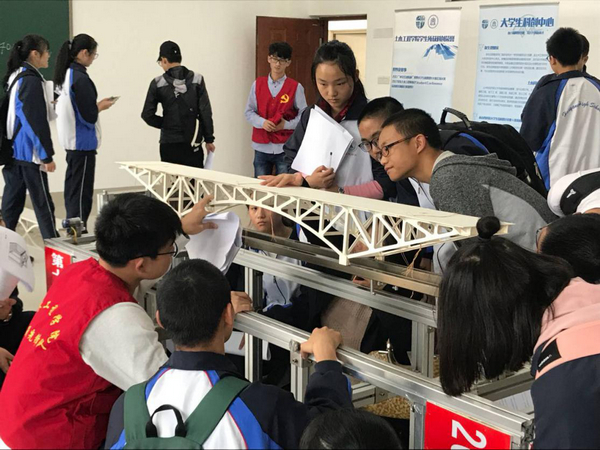 桥梁赛题有关的内容全部讲解完后,工作人员又带领同学们观察了桥梁造型赛题的模型,美丽的斜拉桥、跨海大桥又激发了他们的思维,还普及了桥墩在水下的工程建设方法。周围其它赛题的模型也激发了同学们很高的积极性,他们耐心细致地倾听工作人员的讲解。知识的魅力迷倒了这一群前来学习的“华阳学子”。