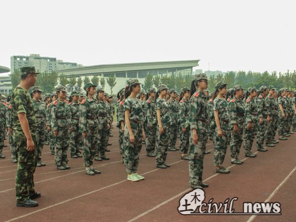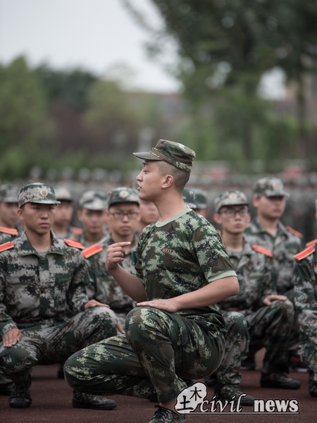 早上的训练告一段落后,下午两点五十分,教官整队,重新集合。和前几天的凉风秋雨不同,当天烈日当空,操场上可谓无一阴凉遮蔽处,但训练依旧不可阻挡地进行着。土木男儿所在的二营正在此时大声喊着口号,踏着脚步,势要与这炽热骄阳一争雄霸。前进、后退、挺胸、抬腿,行动紧随命令,步伐坚决肯定。从零散到整齐,一遍遍来回,一次次练习,被阳光晒得黑黑的皮肤发出光泽,土木男儿展现着他们的精气神。