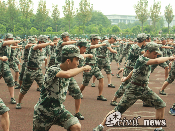 军训的日常训练过后,土木男儿为即将到来的结业典礼的军体拳表演做准备。他们一遍遍地学习着教官的动作,不断地纠正自己。从之前的歪歪扭扭,到如今的掌握一些动作的要领,进步十分快速。为确保每个动作标准,一招一式的训练都有很长定格时间。只能等到教官命令下一个动作才能缓解肢体的酸痛。在艰苦的训练中,下午的时间很快过去。