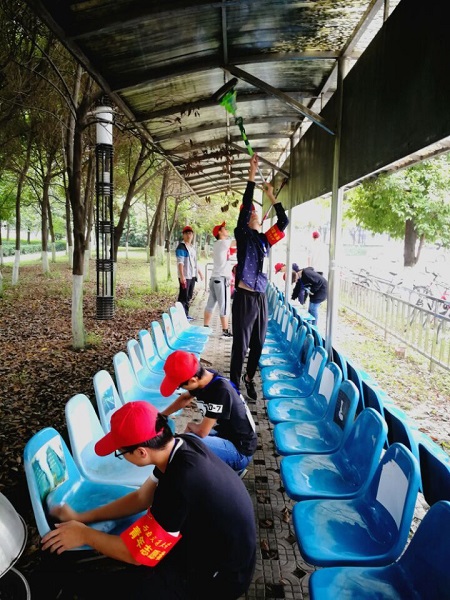 上午的志愿活动在犀浦校区南区校车站进行,成员们都对这次的活动充满了期待,不少人早早的就到了集合地点,用饱满的热情迎接成为志愿者后的第一次志愿活动。八点半,活动准时开始。成员们都带着小红帽,胸前挂着工作证,有的手拿抹布用劲地擦着座椅和栏杆,有的举着拖布清洁亭顶,各项工作都在队长的指挥下有条不紊地进行着。水桶里的水不出几分钟便被抹布上的灰尘涮脏,但队员们雀跃的身影并没有因脏累而变得疲劳,心灵的喜悦是他们挥洒汗水的动力。
