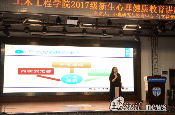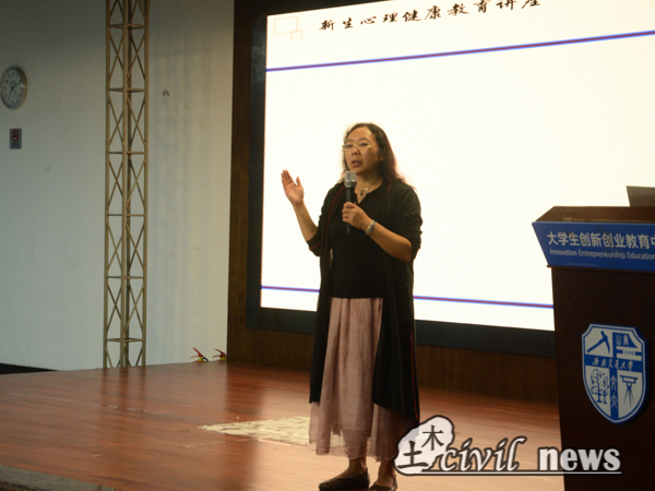 在热烈的掌声中,何教授开始了《新生心理健康教育》主题演讲。她指出大学生涯中,心理健康是自身生活与学习中最重要的一环,她从健康、适应、发展三个方面阐述学生应该如何保持心理健康,还用了“内在安定感”“外不适应”“活力与效能”等词来指导同学们如何自我鉴定心理健康问题。