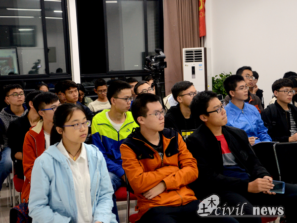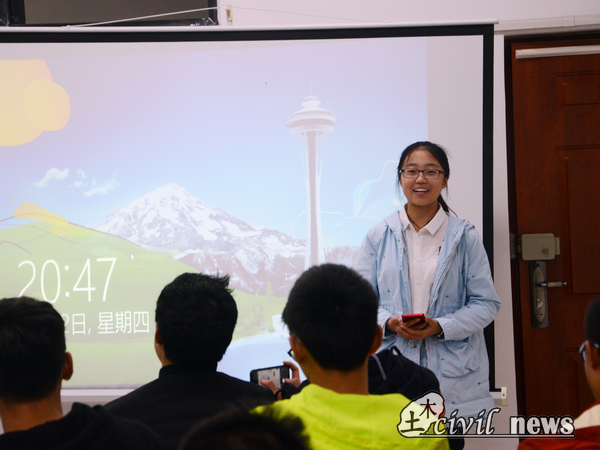 在此次活动中,陶柯免同学以目标为工作与考研为主线,通过学校竞赛、学生工作以及生活三个方面为新生做了报告。会议开始他便引用其助辅的一句话“大学里,学习不是唯一,但一定是第一”作为起始,紧接着便提出效率与自觉两个重要概念,然后围绕这两个重要概念,进一步叙说了去图书馆以及自习的重要性。陶柯免同学列举了几个重要学科,并以英语与土木工程制图两个学科为例子,介绍了自己的一些学习方法与经历。