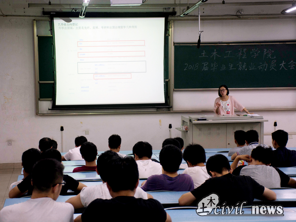 2018届毕业生就业动员大会。本次动员大会由黄雪娇辅导员主讲,向2018届毕业生介绍了以往土木学生毕业后的发展情况以及就业网的使用要点。
