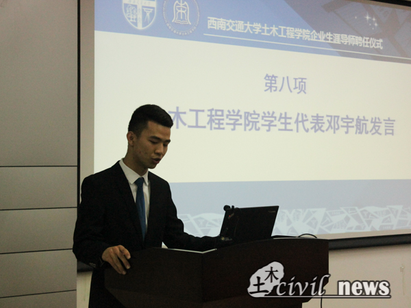 学生代表邓宇航进行发言。他说,希望从导师身上了解更多行业背景、增加人生阅历,使土木学子有更多的提升。邓同学一番激昂的演讲不仅表达了自己对学业以及未来的决心,也表明了土木学子对未来的期许。
