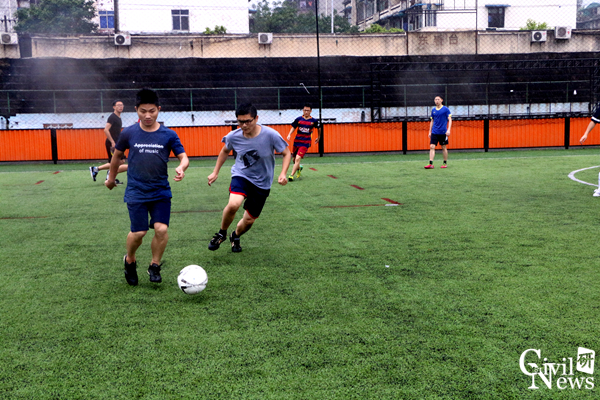 “解放者杯”六人制足球赛之小组赛火热开战,专硕结构对阵博士队、桥梁队对阵综合队。