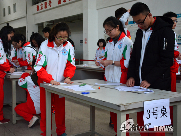 结构设计竞赛获奖人员指导。50分钟的模型制备结束,现场进行了初级振动加载测试,部分模型经受住了振动的考验。