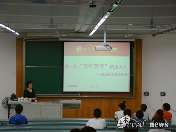 的刘萍和商姚老师分别开始了针对16级新生的“党建专题”教育活动。8点,记者重点报道了团委书记刘萍老师在X4350教室对土木工程专业的13到17班的同学们开展的名为“做一名‘又红又专’的土木人”主题讲座。