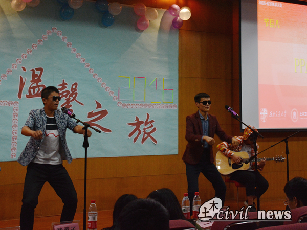接下来出场的T051009舍员们向在场的各位展示了一间别具匠心的寝室。自制的鞋架,贴满著名建筑图片的主题墙、梦幻般的星空、洗手间的别样美景都是他们精心制作的。此外,他们在《焦点反弹》小品中调侃当下热门话题。记者的搞怪采访,无厘头的新闻短报等。幽默诙谐的节目令在座各位忍俊不禁,雷鸣般的掌声萦绕于厅。
